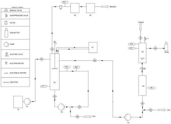 Figure 1. Sketch of the pilot plant. S1: buffer solution; S2–S3: tanks for biogas accumulation; R1: anaerobic digester; R2: reactor for thermal hydrolysis; R3: reactor for OFMSW cooling before anaerobic digester feeding; A1: biogas analyzer; P1: pump for buffer solution; P2: pump for recirculation and digestate drawing; P3: pump for feeding; LT: level sensor; TT: temperature probe; pH1: pH probe; PT1: pressure meter; FT1: biogas flow meter; TI1: temperature indicator; SP: sampling port.