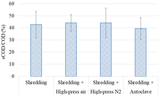 This result is close to the conclusions drawn by Ma et al. [30], which focused on pre-treatments of kitchen wastes. The authors observed a sCOD/COD ratio of 32 ± 8% after waste shredding. When autoclave treatment was added, this value increased to 39 ± 9%, and a similar but lower increase was observed after pressure–depressure treatment (at 10 bar) with CO2, indicating that most of the organic matter solubilization occurred due to shredding. In our study, autoclaving seems to have a negative or no effect on the sCOD/COD ratio, whereas the high-pressure treatment (145 °C and 7 bar) caused only a limited increase in this ratio (i.e., from 43% to 44%).