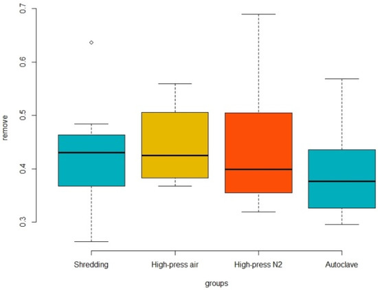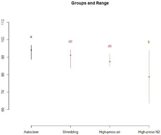 To confirm the statistical relevance of the difference observed, ANOVA and LSD tests were performed; VSS removal efficiency was the only parameter showing significant differences. In particular, the tests confirmed the VSS removal efficiencies obtained when the digester was fed with OFMSW subjected to high-pressure pre-treatment in the presence of nitrogen (i.e., absence of oxygen) and after autoclaving were different between them and from the others. Figure 5 shows the result of the LSD test for VSS removal efficiency. The picture highlights that the VSS removal efficiencies group together when OFMSW is subjected to shredding or high-pressure pre-treatment in presence of air (group “ab”).