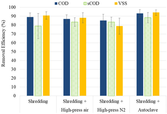 Figure 4. Average COD, sCOD, and VSS removal efficiency for OFMSW subjected to different pre-treatments.