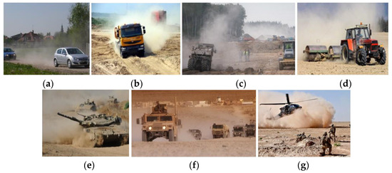Air dust during the operation of (a) passenger cars, (b) trucks, (c) working machines, (d) agricultural machines, (e) tanks on sandy terrain, (f) columns of military vehicles, and (g) helicopters on a random landing site [16].