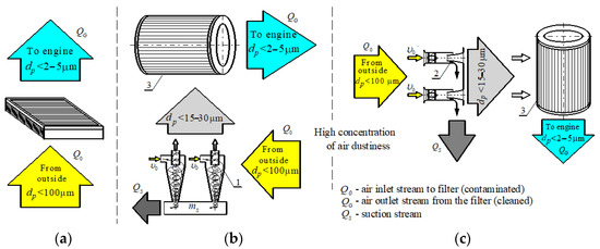 Adequate air purity is then ensured by a filter made of pleated paper with an area of about 2 m2 shaped into a rectangular panel. Filter papers are characterized by a low dust absorption of 200–250 g/m2, which is insufficient in comparison with the mass of dust that should be retained in the inlet system of the engine of a vehicle operated in high air dust. Truck engines; special vehicles: tanks, infantry fighting vehicles (IFVs), and armored personnel carriers (APCs); and work machines are equipped with filters with a two-stage filtration system (Figure 2b,c).