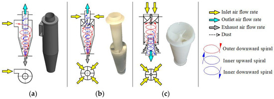 Functional diagrams of the air filtration system in a filter: (a) single-stage (porous partition), (b) two-stage (multicyclone of return cyclones with tangential inlet—porous partition), (c) two-stage (multicyclone of axial flow cyclones—porous partition).