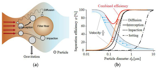 Particle retention mechanisms. (a) Particle retention by single fiber, (b) combined effect of particle retention mechanisms on overall separation efficiency [31].