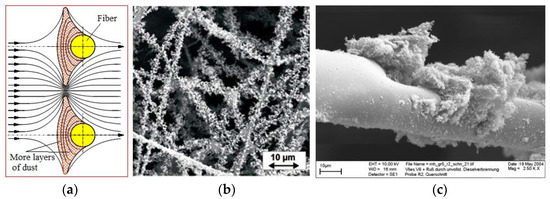 Accumulation of dust particles on filter bed fibers: (a) scheme of growth of successive layers on fibers, (b) structure of filter bed with visible agglomerates formed by dust grains settling on fibers, (c) view of agglomerates on single fiber [34].