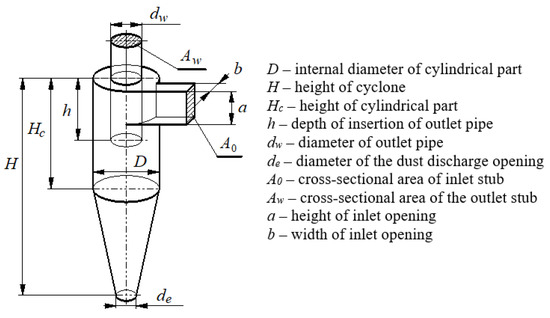 In the upper part of the cylindrical body, there is a tangentially attached inlet nozzle, most often having a rectangular cross-section with sides “a” and “b”. The inlet nozzle is located in relation to the cylindrical part of the cyclone so that its axis is most often perpendicular to the main axis of the cyclone; axial flow cyclones with an inclined inlet nozzle are found. The longer side of the rectangle “a” most often coincides with the side of the cylindrical part, and the shorter (upper) side “b” is located at the level of the upper cover of the cyclone. Centrally, in the cyclone axis, in its upper part, there is a cylindrical outlet tube, most often with a diameter of 0.5D, tightly connected by a circular cover to the cylindrical part of the cyclone. The inlet opening of the outlet tube is located slightly below the shorter side “b”, which prevents direct gas flow into the inlet tube.