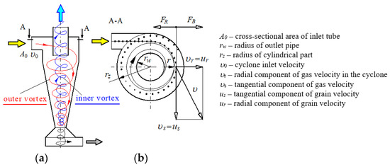 Dust grains for which FB > FR will move in a spiral line and will be directed to the cyclone wall, which is equivalent to their separation. On the other hand, dust grains for which the condition FB < FR occurs will be entrained by the cyclone’s central (inner) vortex and will be discharged toward the cyclone’s outlet tube and then outside the cyclone.