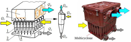 It follows from Relation (1) that with decreasing diameter D of the cylindrical part of the cyclone, while maintaining the same cyclone inlet velocity υ0, the inertia force increases, which results in increased air separation efficiency in the cyclone. This justifies the use of a set of cyclones with small diameters instead of one large cyclone. In automotive technology, sets of several dozen or even several hundred identical, side-by-side return cyclones with tangential inlet or axial flow cyclones, the internal diameter of which of the cylindrical part does not exceed D = 40 mm, are used to filter the air sucked in by engines. An example of a two-stage inlet air filter for a special vehicle engine with a multicyclone of return cyclones with a tangential inlet is shown in Figure 9.