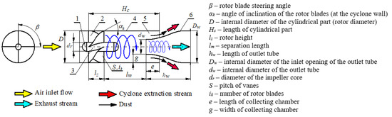 Setting the air stream into rotary motion in a reverse flow cyclone is achieved by feeding it tangentially through a special spigot into the cylindrical part of the cyclone (Figure 3a) or by flowing the stream through non-moving, obliquely positioned, steering wheels, which are fixed between the inner wall of the cylindrical part and the cyclone’s outlet tube (Figure 3b). The stream introduced into the cyclone creates a spiral main vortex (external vortex), which moves down to the dust collection opening. At this time, the generated inertial force causes the movement of particles with a larger mass towards the inner wall of the cylindrical part of the cyclone. After reaching the cyclone wall, the particles slow down, and then they continue to spiral towards the bottom of the cyclone (with a small contribution of gravity) in the wall area of the conical part ending with the dust removal opening. The dust removal opening is tightly connected to the dust settling chamber, where the particles are transferred by the spiral motion acquired in the cyclone and then settle at the bottom of the settling chamber.