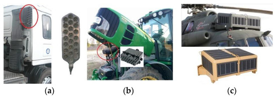 For this reason, continuous cyclones are increasingly used as the first stage of air filtration in combustion engines of motor vehicles [43,44,45] and helicopter turbine engines [46,47,48]. In industrial applications, continuous cyclones are used for the separation of the “liquid–liquid” [49] and “liquid–gas” [50] phases and for the separation of solid particles from exhaust gasses at high temperatures [51]. Examples of the use of continuous cyclones for the filtration of air from propulsion engines are shown in Figure 12.