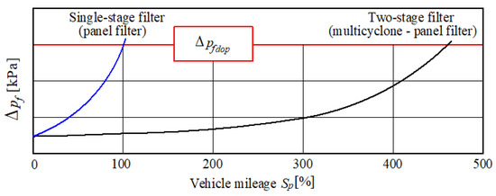 The limited literature data indicate that a two-stage filter, compared to a single-stage filter, extends the service life of the air filtration system several times (until the permissible filter pressure drop value Δpfdop is reached). In a combustion engine of a motor vehicle, this is associated with an extension of the vehicle’s mileage (Figure 13). The Δpfdop values of air filters of motor vehicle engines, determined from the condition of a 3% decrease in engine power, are at the level of 2.5–4.0 kPa—passenger car engines and 4–7 kPa—truck and special vehicle engines [52,53]. The intensity of the increase in air filter resistance during operation depends on the amount of dust directed from the multicyclone to the filter element, which is mainly determined by the efficiency of the cyclones, and on the filtration properties of the partition filter, which is decisively influenced by the properties of the filter material from which it is made.