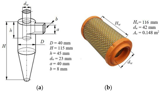 The first filtration stage of filter assembly no. 1 was a tangential inlet return cyclone with the parameters shown in Figure 15a. The second filtration stage was paper test filters, A1 and A2, with the dimensions given in Figure 15b.