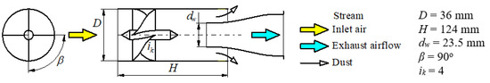 The axial flow cyclone has a different design than the return cyclone with a tangential inlet and consists of three main parts: the impeller placed in the front cylindrical part and the outlet pipe placed in the rear part of the cyclone (Figure 10). The impeller is designed to give the airflow entering the cyclone a swirling motion, which results in a spiral motion. The basic element of the impeller is the central core, to which the blades (directors) with a helical surface are attached symmetrically. The blades, the number of which is usually four, are inclined relative to the cyclone axis at an angle αk. The inner diameter of the cylindrical part of the cyclone and the outer diameter of the impeller D have the same value.