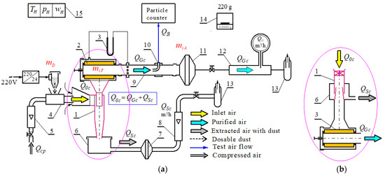 Figure 14. “Cyclone–research cartridge” filtration unit: (a) return cyclone with tangential inlet—research filter, (b) axial flow cyclone—research filter, 1—cyclone, 2—research filter, 3—dust settling tank. - Unit no. 2—axial flow cyclone—test filters B1, B2, and B3 (Figure 14b).