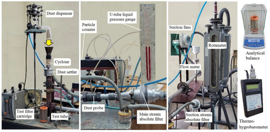 During the experiment, the original research methodology of testing a single cyclone and a test filter with an appropriately sized surface was used. During the testing of the assembly (cyclone–test filter), conditions corresponding to the actual operating conditions of a two-stage air filter were maintained, and these included the filtration rate in the filter, the dust concentration in inlet air, and the inlet velocity of the cyclone. The characteristics of the efficiency, filtration performance, and pressure drop were determined as a function of the mass of dust delivered to the unit (cyclone–paper filter) or directly to the filter. A return cyclone with a tangential inlet and axial flow cyclone were used as the first filtration stage.