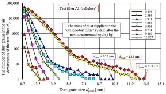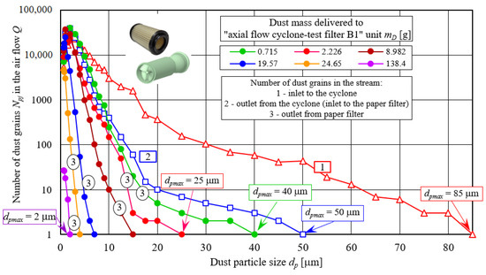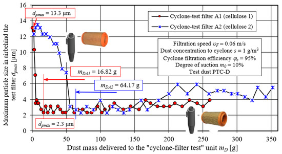 The results show that the research filter B2, which worked in the filtration system as a second stage behind the through cyclone, achieves better indicators in terms of achieving the target flow resistance of 3 kPa. This value is obtained by the research filter much (three times) later than when it works without the cyclone. This is due to the fact that a significant part (about 85%) of the mD dust mass is retained by the cyclone, and only a minor part is directed to the filter (Figure 28). The diameters of the maximum dust grains, dpmax, in the air stream downstream of the B2 filter operating in the “filter unit” take on a much larger size in the first stage than downstream of the B2 filter operating without the cyclone (Figure 29). This is due to the higher proportion of small-diameter dust grains in the air, as large-diameter grains were separated by the cyclone. Dust grains with small diameters are much slower to form dendrites on the fibers and slower to fill the space between the fibers; hence, at first, the dust permeability is much higher and the efficiency takes on small values. With the accumulation of dust in the bed, the permeability of the dust layer formed by dust grains of small sizes is much lower, due to their tight adhesion to each other and easier penetration into the structure of the filter material compared to grains of larger diameters. Therefore, the dpmax grains behind the filter take on smaller and smaller values, and after the dust mD = 14.3 g is delivered to the system, they are at the level of dpmax = 1–3 µm (Figure 29). Such high filtration accuracy is also due to the fact that the standard filter bed (cellulose + polyester) has been overlaid with a layer of nanofibers, which is an effective barrier to small-sized dust grains.