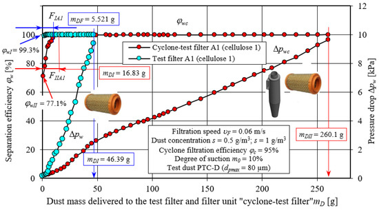 - Lower values of separation efficiency occur for a filter operating in a two-stage system, and thus it takes longer for the filter to operate until it reaches the set efficiency value (φw = 99.5%), which is the criterion for the end of the initial period. This is due to the fact that a smaller mass of dust and of smaller size is directed at the filter operating in a two-stage system, which makes it more difficult to retain and collect.