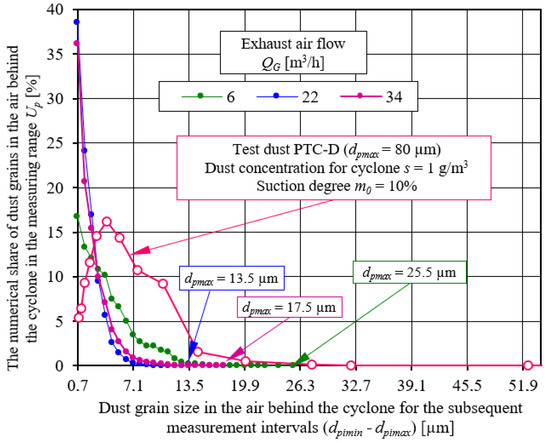 In addition, the number of dust grains found in the cyclone inlet stream (line 1) and the cyclone outlet stream (inlet to the paper filter) (line 2) is shown for comparison—Figure 26. A significant difference (for dust grains of the same size) between the number of grains at the cyclone inlet and outlet is evident. For example, the number of dust grains with a size of dp = 20 µm at the cyclone inlet is Npi = 365, and at the cyclone outlet, Npo = 10, which gives a quotient of 36.5. As the dust grains decrease, the quotient decreases in value and for dust grains with a size of dp = 10 µm, it is 7.59. This confirms the cyclone’s high-separation properties for large dust grains, resulting in only a small mass of smaller-sized dust being directed to the paper filter.