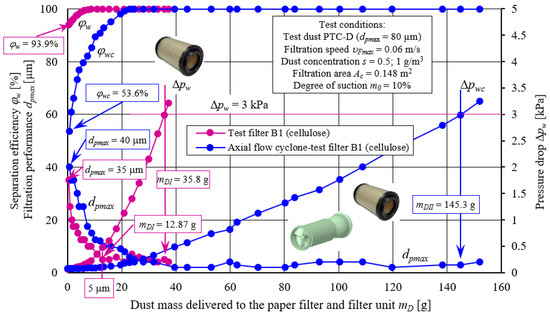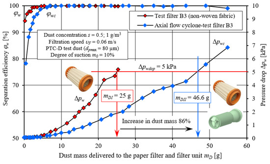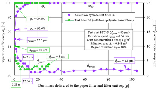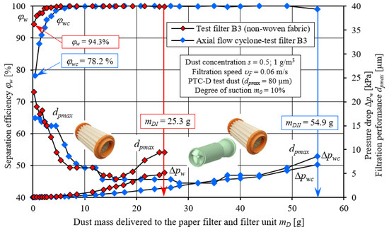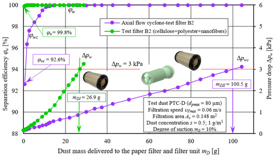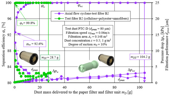 Variation in the filtration efficiency φw = f(mD) and filtration performance dpmax = f(mD) of the test filter depending on the mass of dust mD dosed to the cyclone of the system “axial flow cyclone–test filter B2” and directly to the filter.
