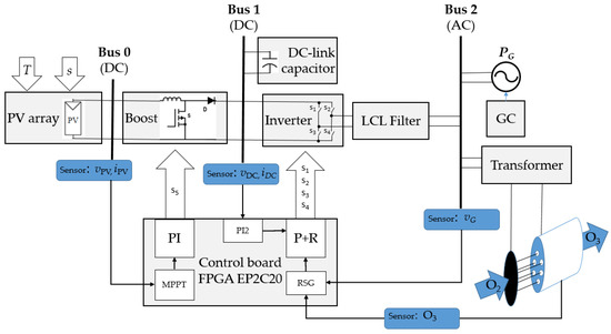 Assuming that the energy needed to generate ozone comes not only from the generator (PG), but also from the photovoltaic panels, a photovoltaic converter is connected to Bus 2 to transmit the converted solar energy. The amount of energy available depends on environmental parameters such as the outdoor temperature T and the solar irradiance s, and is a function of the installed power of the PV. The operating point of photovoltaic panels is determined by the Maximum Power Point Tracker (MPPT) that implements the incremental conductance algorithm [27] based on the current values of the photovoltaic voltage vPV and the photovoltaic current iPV. In the proportional integral control algorithm (PI), the fill factor is determined for the switch s in the boost converter. This converter controls the capacitor charge current in the DC link in a way that allows the maximum power point of the PV to be obtained. Increasing or decreasing the current feed into the DC link causes the voltage across Bus 1 to rise or fall, respectively. To counteract this, based on the measured voltage value in Bus 1, another proportional integral regulator (PI2) controls the reference current of the grid converter (inverter), leading to voltage stabilization in Bus 1.