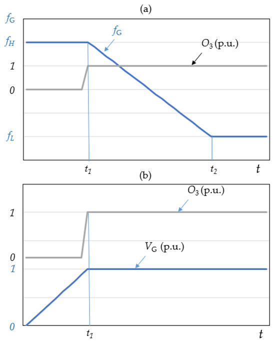 The tested system is part of an on-board system developed and reported in publications [26], in which the solar energy conversion subsystem is connected to Bus 2. Bus 2 supplies power to a facility characterized by a high-steep voltage frequency trajectory during the start-up phase. It was assumed that the trajectory of changes in the voltage generator’s operating parameters is made independently through the system (GC) controlling the operation of the power generator (PG). In the research conducted, the device start process was assumed by implementing a reference voltage trajectory according to the curves shown in Figure 2.