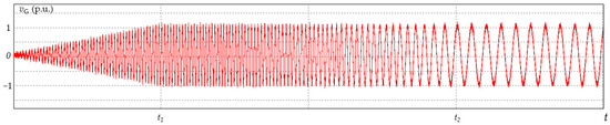 Taking into account the voltage frequency trajectory from Figure 2a and the voltage amplitude trajectory from Figure 2b, the voltage waveform vG on Bus 2 can be described as follows.
