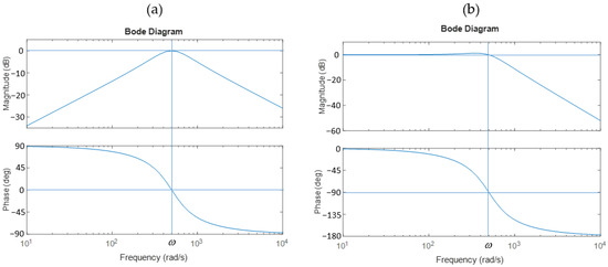 where and are orthogonal signals, v is the input signal and ω = 2πf. The Bode plots corresponding to Equations (17) and (18) are shown in Figure 4.