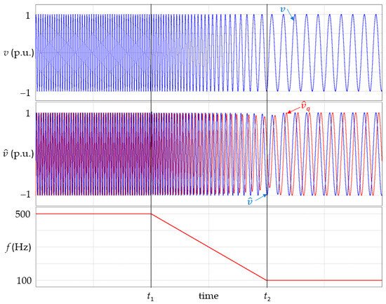 During the test, it was assumed that the input signal v is in the form of a fixed frequency signal fH = 500 Hz, which at time t1 changes into a chirped signal with a linear modulated frequency. The linear frequency modulation ends at time t2, when the frequency of the chirped signal reaches fL = 100 Hz. The waveforms of the input signal applied to the generalized second-order integrator and the frequency change profile are shown in Figure 6.