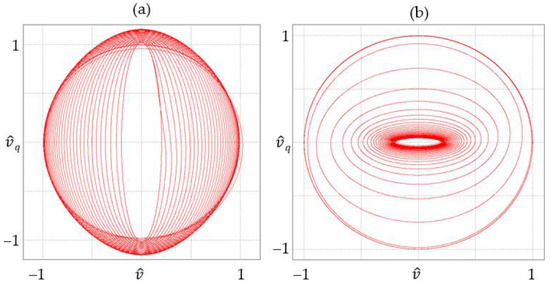 Trajectory of quadrature signals formed in the generalized second-order integrator for (a) ω = 500 Hz, (b) ω = 100 Hz.