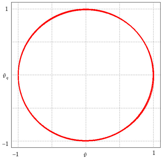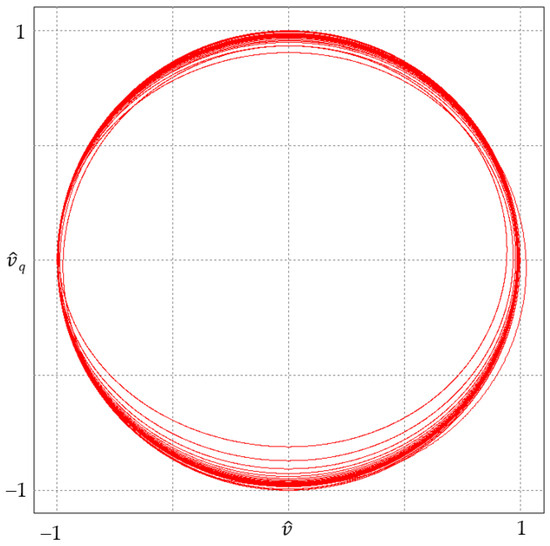 When comparing for the same conditions the obtained trajectory of quadrature signals, including AZOH (Figure 14) with the trajectory obtained for SOGI without the frequency trajectory adaptive system (Figure 8), it can be concluded that the obtained signals are unitary sinusoidal signals and are orthogonal. During the full profile of frequency changes, the trajectory for AZOH maintains a circular profile that generates overlapping paths. The minor variations are due to computational errors and are of marginal significance.