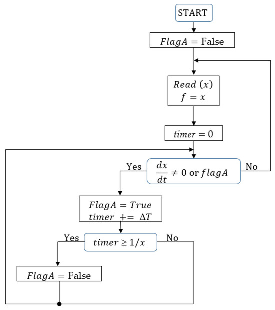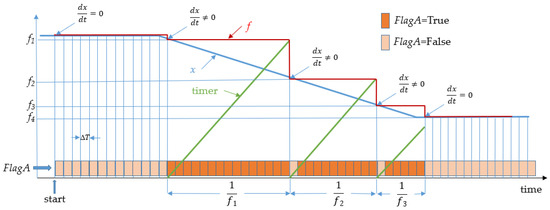 The proposed solution to the problem of changing the fixed transmittance parameter of the reference signal was based on a single-flag system. Systems based on flags are classic synchronization mechanisms that are used in concurrent programming. Their primary goal is to manage access to shared resources among multiple threads to prevent conflicts and ensure correct cooperation. The assumed binary flag (FlagA) is set when the frequency change trajectory (x) is changed. At this point, the timer is reset; after that, the interval is measured, which is derived from the latched period value resulting from the set trajectory of frequency changes. The timer used measures time with a resolution resulting from the set interval ΔT. After measuring the current value of the reference waveform, the frequency value is updated and the new value is read from the set trajectory (x). To properly work with the algorithm shown in Figure 9, the time relations associated with the calculations performed must be met. These relations are shown in Figure 10.