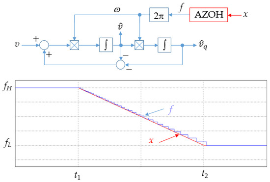 Taking into account the proposed frequency change adaptation system explained in Figure 10, the RSG system can be depicted as in Figure 11. In the shown system, a pre-set frequency change trajectory is input to the quadrature signal generator via an adaptive zero-order hold block (AZOH). AZOH samples the input trajectory x with varying frequency and holds the sampled value until the next synchronization cycle. The set frequency trajectory is marked in Figure 11 as the red x waveform, and the resulting frequency is marked blue as the f waveform.