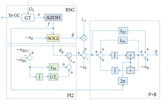 Taking into account the quadrature signals obtained from the proposed system, the waveform of the signal modulating the operation of the inverter switches was calculated using the proportional-resonant control algorithm. A diagram of the complete control system is shown in Figure 12.