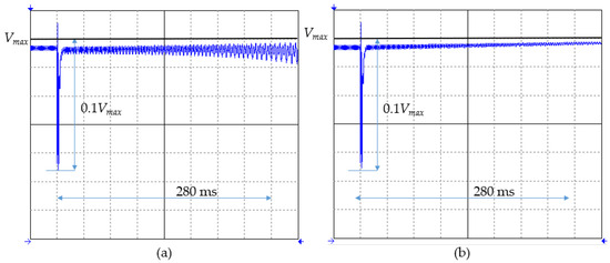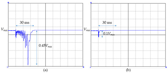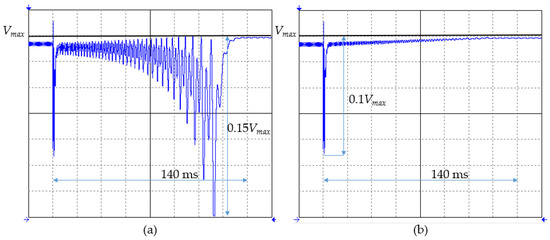 It can be seen in Figure 16 that reducing the duration of the linear frequency change by half does not affect the operation of the RSG with AZOH. The waveforms in Figure 15b and Figure 16b are the same. When AZOH is not used in the SOGI system (Figure 16a), changes in the amplitude of quadrature signals that reach 0.85 Vmax appear. Also, it should be noted that the amplitude changes continue for the entire duration of the frequency reduction.