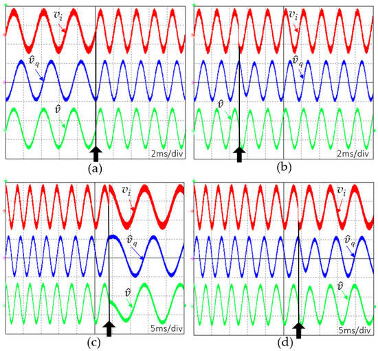 The application of a generalized second-order integrator in a synchronization system with the proposed AZOH requires standard tests designed for PLL systems. In this study, tests were carried out for frequency step change and phase angle step change. Since the designed synchronizer operates in a system where, as a result of the ozoniser power process, the voltage frequency changes dynamically (Figure 2), tests were conducted for a constant voltage frequency and a linearly changing voltage frequency. Figure 19a shows the response of the synchronizer in the form of quadrature signals and for a step change in the frequency of the input signal vi from 300 to 500 Hz. Due to the use of AZOH, no significant disturbance is observed in the output signals. During the operating mode of the system, when the frequency of the input waveform is linearly reduced and a step change in frequency to 100 Hz occurs at the time of the disturbance, the reference waveforms establish steady-state within a period. This situation is shown in Figure 19c. The investigated system was also tested for a step change in phase angle. Tests were performed for a step change in phase angle of π/3 at a constant input signal frequency of 500 Hz. The recorded waveforms are shown in Figure 19b. Figure 19d shows the signals recorded with a phase angle step change of π/3 during linear frequency reduction in the input waveform. Similar to the tests for frequency step change, in the case of phase angle step change, the waveforms establish steady state in a time shorter than the one period of the input signal. The response time of the system is characteristic of second-order integrators due to its dynamics.