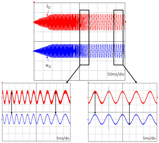 Figure 21 shows the waveform of the grid inverter current and voltage registered on Bus 2 with a non-zero set active component and a zero reactive component. From the analysis of the results, it can be seen that in all start-up states, including voltage rise at constant frequency, linear frequency reduction, and steady state, the current waveforms are in phase with the voltage waveform.