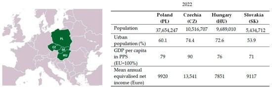 Our research focuses on four countries in Central Europe: Czechia (the Czech Republic), Hungary, Poland, and Slovakia, known as the Visegrad Group (V4). A common location and similar geopolitical conditions, including historical and cultural backgrounds, characterize these countries. Basic information about the Visegrad Group countries is presented in Figure 1.