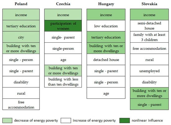 The above analysis reveals the traits of a typical household endangered by energy poverty in each country. Specifically, in Poland, such a household would likely be located in a rural area with free accommodation, consisting either of a single parent or an elderly lonely individual. Any household member’s highest level of education would be below upper secondary, and there would be a disabled person in the household. In the case of Czechia, household endangered by energy poverty would typically be single-parent households living in buildings with less than ten dwellings or households with an average age of family members above 72 years. In Hungary, on the other hand, households at risk of energy poverty would be single-parent households or elderly, lone individuals, living in a detached house, with the highest level of education among family members below upper secondary. In contrast, in Slovakia, households vulnerable to energy poverty would be households with at least three children, living in semi-detached houses in rural areas with free accommodation, and with disabled persons or unemployed members.
