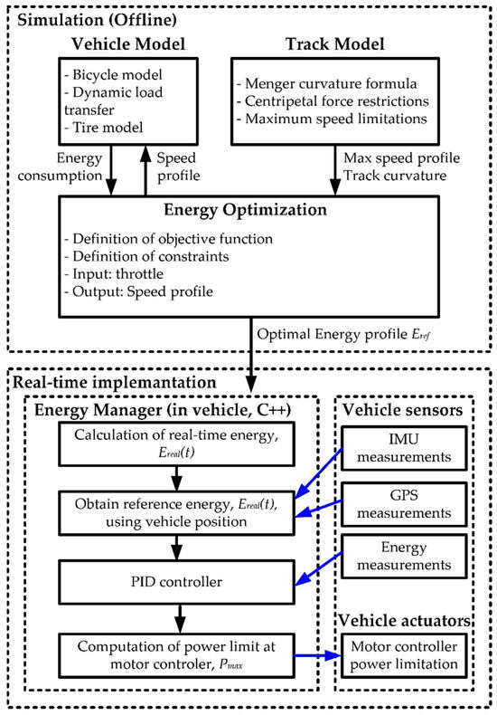 It was essential to first model the vehicle and track it to optimize energy consumption. This modeling would enable the prediction of energy usage. The methodology, summarized in Figure 1 as a flowchart, began with defining the vehicle and track models. This step allowed for an accurate estimation of the vehicle’s energy consumption under specific track conditions. Using these models, offline energy optimization was performed to refine the speed profile, aiming to maximize points in the endurance competition. Once the “optimal” speed profile was determined, it was converted to an equivalent “optimal” energy profile due to competition restrictions (remote speed control is not permitted). In real time, an energy management algorithm estimates the energy consumption and compares it with the reference profile at the current distance traveled by the vehicle, utilizing IMU and GPS signals. A PID controller uses this error to adjust the power limitations of the motor controllers in real time, ensuring the energy driver adheres to the optimized energy profile. Special attention is given to the distance traveled estimator, as accumulated deviations could lead to incorrect operations on the track (e.g., accelerating before a turn).