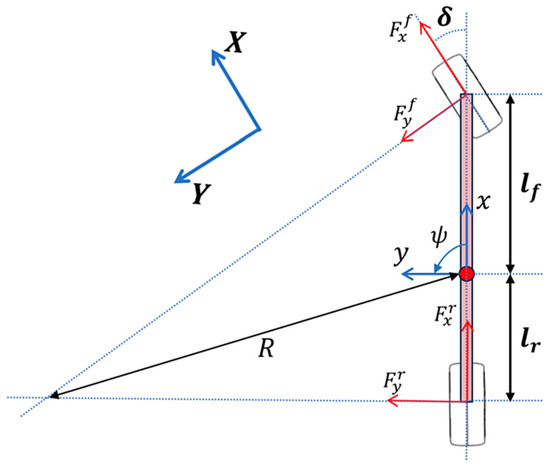 The vehicle model built on Newtonian mechanics was based on the dynamic bicycle, dynamic load transfer, and tire models described in [20], and using the models’ parameters previously obtained in Appendix A from [21]. Its geometry can be visualized in Figure 4. The model predicts the evolution of the vehicle state vector x = [X, Y, ψ, vx, vy, r]T. Here, X and Y refer to the vehicle’s global position coordinates, ψ is the vehicle’s orientation, vx and vy correspond to the vehicle’s longitudinal and lateral velocities, respectively, and r is the time derivative of the vehicle’s orientation, also known as the yaw rate. The input vector contains the normalized pedal input, p, and the wheel steering angle, δ, described as u = [p, δ]T.