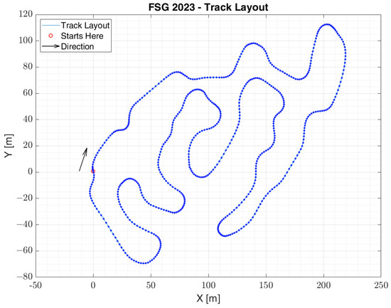 Figure 5 illustrates the official FSG 2023 track layout (clockwise direction) obtained from GPS sensor data. The FSG competition track has a single-lap distance of 1220 m. So, the competition defines the total lap number as 18 laps to complete the endurance event, which is worth roughly 22 km.