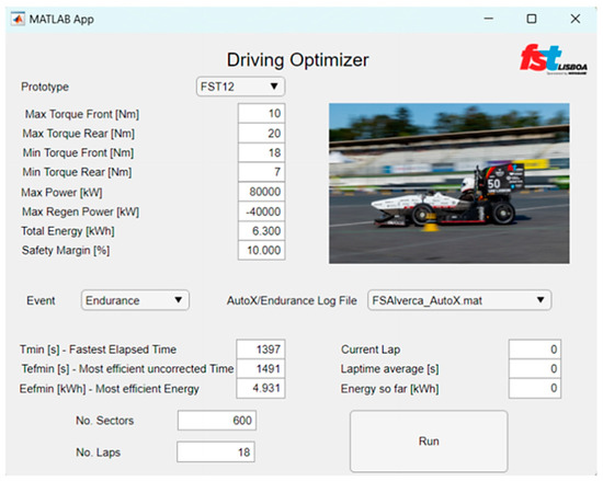 A simulator was developed in MATLAB 2023b to run the optimization environment (Figure 7). It starts by initializing an app interface that asks the user to input the track layout, vehicle’s physical and powertrain parameters, and optimization parameters. After discretizing the track environment, the program simulates multiple iterations of the endurance event using the appropriate vehicle model, while optimizing the control vector with the cost function (24) to maximize the scores in both endurance and efficiency events. For this purpose, the MATLAB optimizing function fmincon is used to find the optimal solution given the constraints or a limit of iterations. After reaching the optimal solution, an output file containing the optimized energy reference line in function of the distance is generated.