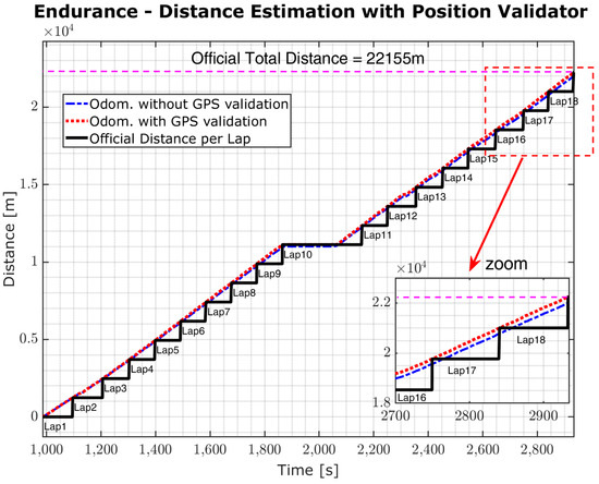 Using logged data from the most recent endurance event (FSG23), with the maximum acceptable discrepancy defined at Rmax = 5 m, the position validator eliminated the accumulated residual error of the inertial odometry worth over 140 m, as seen in Figure 8.