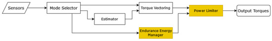 The system takes an optimal energy reference line in function of distance as its input and continually adapts the vehicle’s maximum power constraint, denoted as Pmax. Given the endurance distance status, this adjustment depends on whether the current energy level exceeds or falls short of the expected energy level. An error (28) is computed between the current energy level and the referenced setpoint. This depends on continuous distance estimation, d, along the endurance event: