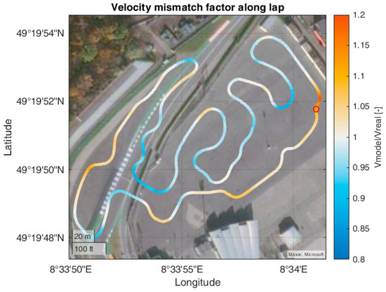 Velocity mismatch factor along a lap. The red circle identifies the point with the highest deviation.
