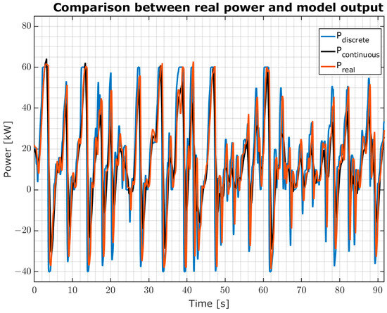 Comparison between the real measured power and the continuous and discrete simulation models.