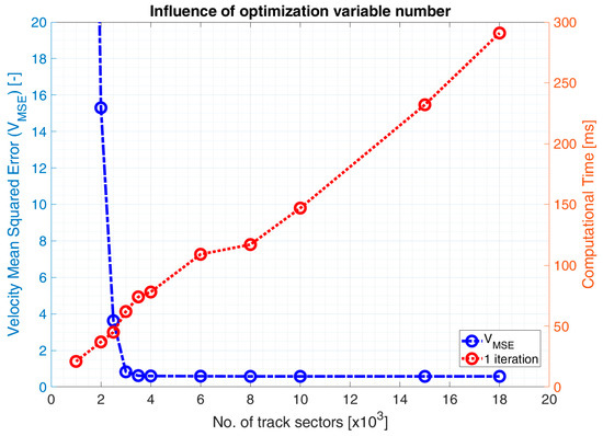 To evaluate the influence of the number of track sectors on the velocity mismatch and computational time, a study was conducted by changing the number of track sectors and comparing the final results with the continuous model. Figure 12 shows the evolution of the velocity mean-squared error and the computational time as a function of the number of track sectors. Beyond 3000 lap sectors, there was marginal improvement in terms of model accuracy, while the single iteration time steadily increased linearly. This had substantial implications for the optimization time, particularly when the process involved computing thousands of iterations to identify the optimal solution. Thus, the number of track sectors was defined as 3000.