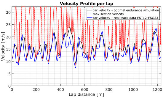 In the endurance event, the focus was on lap time optimization and energy consumption. The balance was modeled in the cost function (24). The objective was to achieve the highest joint score while ensuring the car completed the 22 km distance within its maximum energy capacity and physical limitations. Running the optimization of the FST12 prototype around an 18-lap endurance event on the official 2023 FSG track layout (see Figure 5), the resulting velocity profile along time is shown in Figure 13. Additionally, it was compared to the maximum velocity in each track section, as defined in Equation (17), and with the real track data obtained from the competition in 2023 (FST12, FSG23) without the energy optimization algorithm. Figure 14 shows the resulting power deployment along the lap.