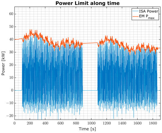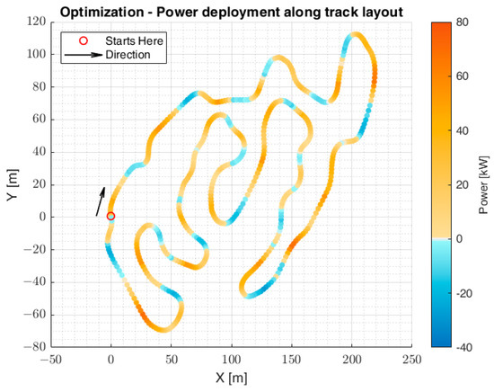 Physically, the car’s velocity at each sector is limited by its maximum velocity, vtop, or the maximum allowed centripetal force, . This is expressed in (17), where vtop is the vehicle’s top speed, R is the turn radius, D is a tire coefficient that refers to the maximum lateral force in each tire, and m is the vehicle’s mass. This equation only limits the car’s velocity to avoid sliding during curves. The selection of the braking point is performed by the optimization problem, which optimizes the speed for each track section to maximize the endurance and efficiency scores. The braking performance was carried out by considering a drop in average efficiency of 10% of the electric motors when compared with their motor mode. This was calibrated experimentally, and the comparison between the experimental measured power and the simulation ones will be shown in Section 3.