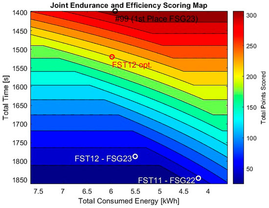 In summary, the optimized profile of the FST12 completed the simulated FSG endurance event with a total elapsed time of 1520 s, consuming a total energy of 5.985 kWh (out of 6.3 kWh), showing that it is not optimal to consume all available energy for maximum points. As a result, the average lap time was 84.44 s, with an energy consumption of 0.333 kWh per lap, which would result in 177 points and an additional 35.7 points for efficiency, bringing the total to 212.7 points out of 325, as illustrated in Figure 15. Also, this figure shows the real points obtained by the FST team in the competitions of 2022 (FST11, FSG22) and 2023 (FST12, FSG23, data in Figure 13) without energy optimization. This optimization process can achieve a high increase without changing the vehicle’s performance and structure.